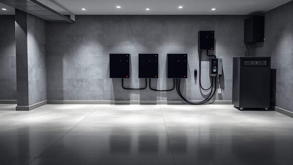 To keep my luxury battery backup units running smoothly, I regularly check the system’s connections and monitor performance through the app or display. I guarantee the batteries stay clean and free of dust, and I follow the manufacturer’s recommended maintenance schedule, including software updates. I also have a professional inspect the system annually to catch any issues early and maximize efficiency during outages.