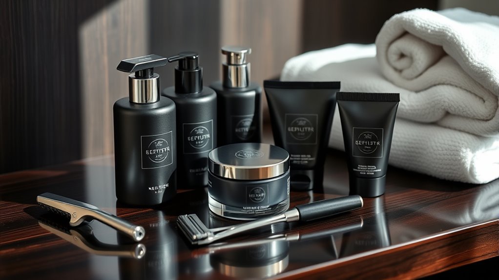 Ever wondered what sets high-end men’s skincare kits apart from standard options? It’s primarily their ingredient quality standards. These premium kits prioritize clinically tested, natural ingredients free from harmful chemicals like parabens, sulfates, and artificial fragrances. They often feature active components such as hyaluronic acid, retinol, antioxidants, and plant extracts, all meeting strict efficacy and safety standards. The sourcing and formulation are usually certified organic, cruelty-free, and comply with industry regulations, ensuring consistent quality. Transparency is key; brands openly share ingredient origins, concentrations, and purposes. Rigorous quality control processes, including testing for purity, stability, and allergenicity, guarantee these products deliver safe, effective results. In essence, high-end skincare emphasizes ingredient integrity to elevate your grooming routine.