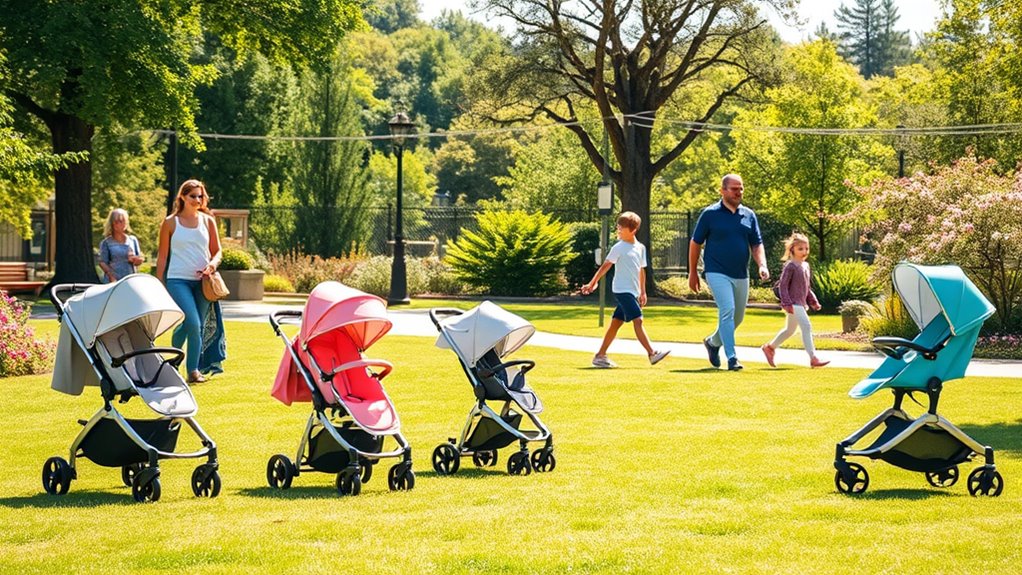 Choosing the right canopy coverage for my lightweight stroller is essential, especially when traveling with little ones. I look for a larger canopy that offers UPF 50+ protection, as it shields my child from harmful UV rays and light rain. A canopy that extends or has flip-out visors allows me to customize sun protection based on the sun’s position, ensuring my child stays safe throughout the day. I’ve learned that limited canopy sizes can leave kids exposed, so adequate coverage is vital for longer outings. While mesh canopies improve ventilation, they might compromise sun protection. This is especially important for infants and toddlers, whose sensitive skin requires extra care when we’re out exploring.