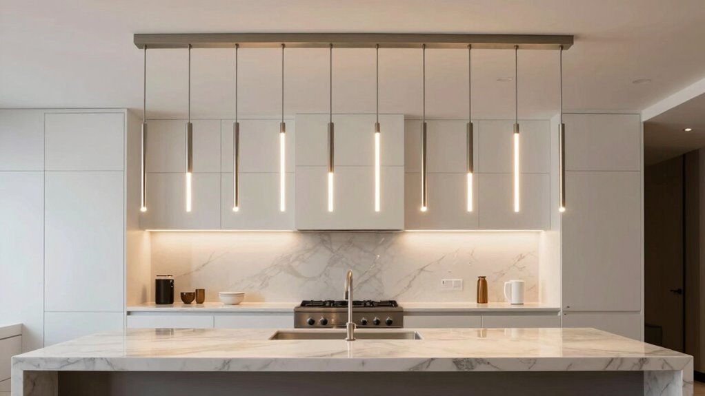 Selecting the right height and length for a linear chandelier is essential to achieving both functional lighting and visual balance in your kitchen. I recommend measuring your ceiling height to determine the ideal hanging length, usually about 30 to 36 inches above the countertop for maximum illumination. Keep in mind that adjustable fixtures give you flexibility, especially if your ceilings are vaulted or sloped. The chandelier’s length should also match the width of your kitchen island, generally spanning half to two-thirds of it, to create a balanced look. Make sure the fixture isn’t too small or overwhelming; it should complement the size of the space it illuminates. Proper height and length ensure your chandelier enhances both the functionality and aesthetics of your kitchen.