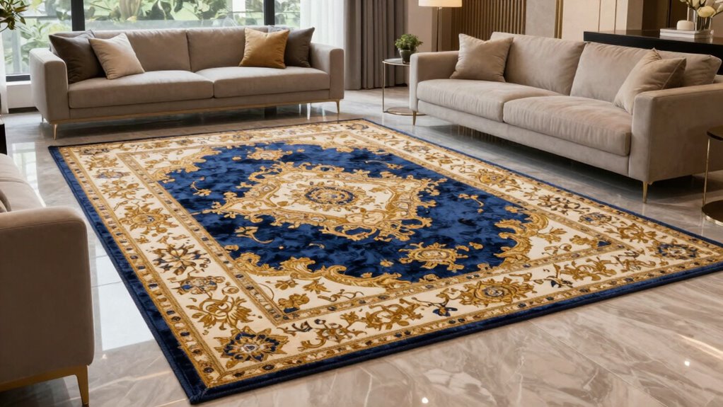 When selecting a luxury 12×15 rug for a large living room, I focus on several key factors. Material quality, style, size, comfort, and durability all play a role in making the right choice. Considering these points helps guarantee the rug not only looks great but also lasts and fits perfectly.
