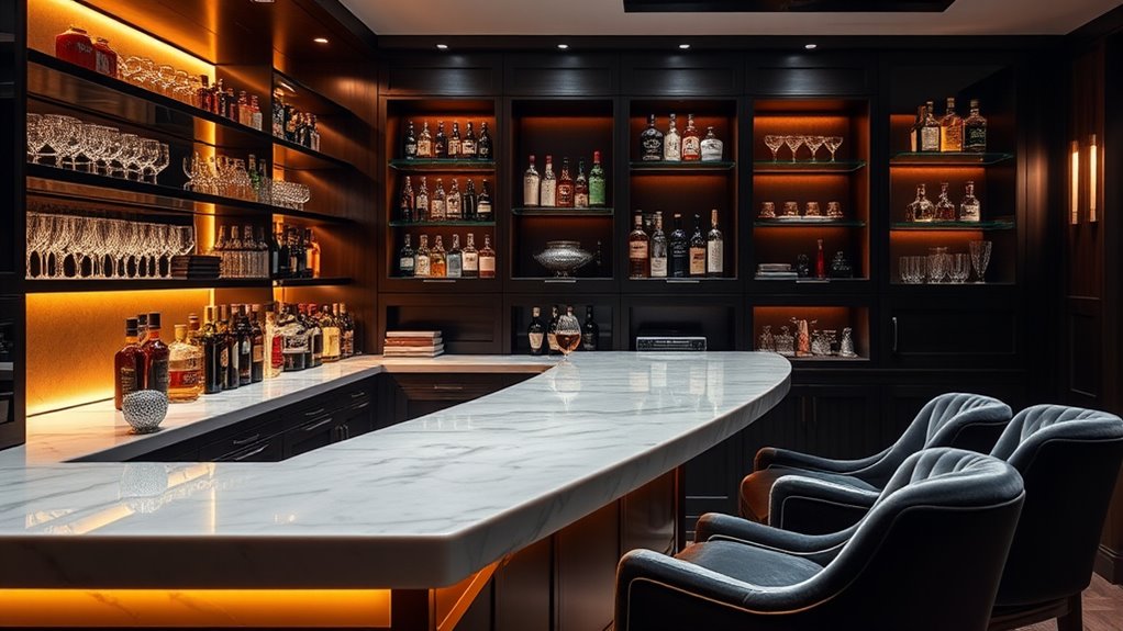 The essential features of a luxury home bar setup include high-quality materials like marble or wood, a variety of premium spirits, and elegant glassware. I also incorporate sophisticated lighting, a stylish wine fridge, and ample storage for accessories. To elevate the experience, I add a comfortable seating area and thoughtful decor. These elements create an inviting, upscale atmosphere perfect for entertaining guests and enjoying a refined drink.