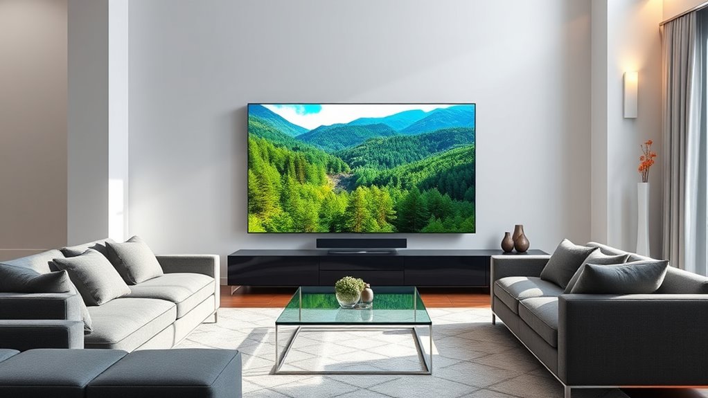 Ever wondered how your TV’s design can enhance your viewing experience? The overall look matters just as much as the picture quality. Consider the bezel size and shape—sleek, minimal bezels create an immersive, modern feel. An ultra-slim profile adds a sophisticated touch and fits seamlessly into any room. Pay attention to the stand or mounting options to guarantee stability and compatibility with your setup. A seamless finish or contemporary materials can elevate your interior decor, making your TV a stylish focal point. Choose a design that matches your personal style and room palette for a cohesive look. Remember, a visually appealing TV isn’t just about aesthetics; it also complements your space and enhances your overall viewing environment.