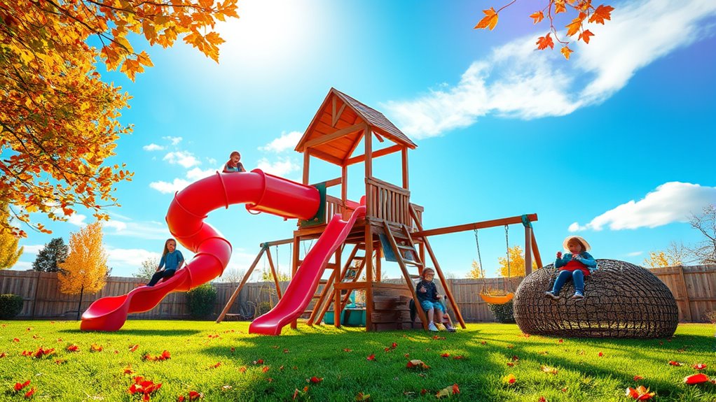 Looking for the best outdoor playsets kids will love in 2025? I’ve found top options like cedar wood sets with slides, swings, and climbing walls, as well as lightweight plastic playhouses and monkey bars. These sets support active play, foster imagination, and fit various yard sizes. I’ll share all the key features, safety tips, and budget considerations to help you choose the perfect one. Keep going to discover all the details!