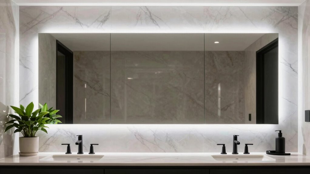 Lighting customization is essential for creating a functional and comfortable bathroom space, especially with oversized mirrors that can dominate the room. I look for mirrors with stepless dimming features, allowing me to adjust brightness from 5% to 100% for the perfect lighting level. Multiple color temperature options, like warm, natural, and daylight white, help set the right mood and suit various tasks. A mirror with a memory function is handy, as it remembers my last lighting and brightness preferences, saving time. I also prefer models with independent anti-fog and lighting controls, so I can customize fog prevention separately from illumination. finally, high CRI LEDs (90+) are a must for accurate color rendering and consistent lighting across modes, ensuring everything looks natural and well-lit.