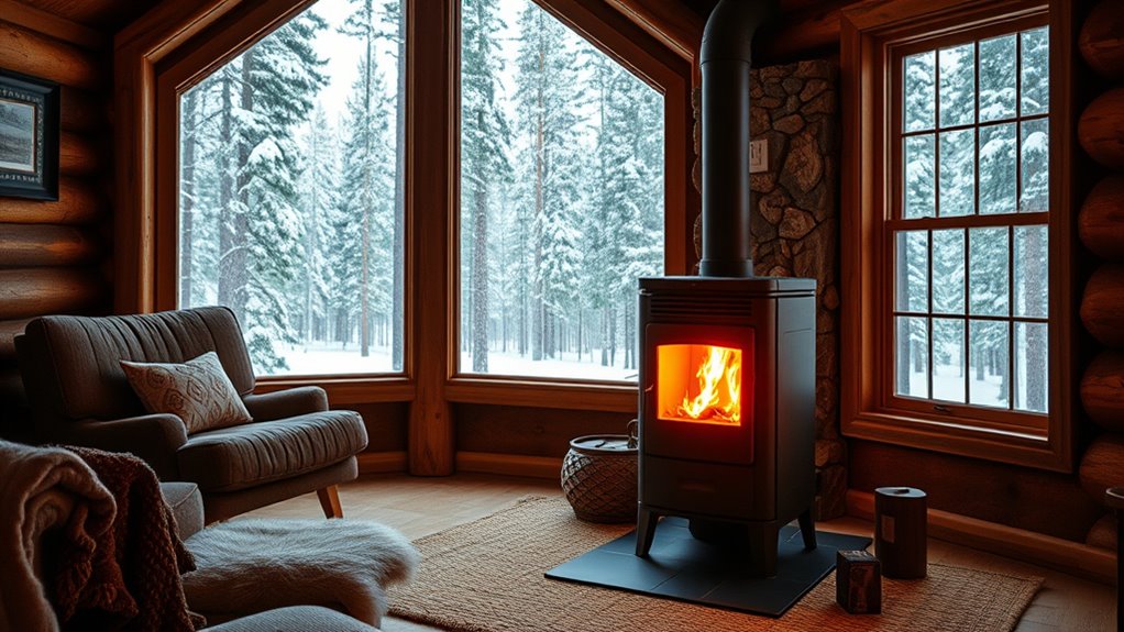 Did you know pellet stove emissions can impact indoor air quality? I’ve found that while modern stoves are designed to be cleaner, they still release tiny particles and gases that could affect breathability. Proper ventilation is essential; I always make sure my cabin is well-ventilated and use high-quality pellets. Regular maintenance also helps reduce emissions, keeping my space healthier and safer for everyone inside.
