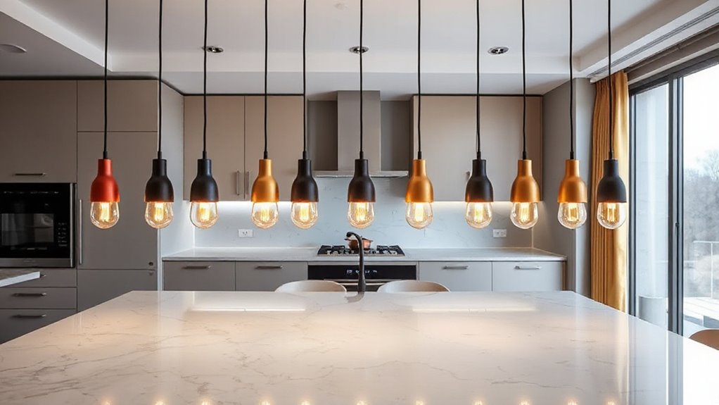 Did you know that the ideal height for pendant lights is generally 30 to 36 inches above the kitchen island? I recommend hanging them within this range to ensure they provide adequate task lighting without obstructing your view or workspace. I find that measuring from the countertop’s surface guarantees consistent lighting and a balanced look. Adjust based on your ceiling height and personal preference for a cozy or airy feel.