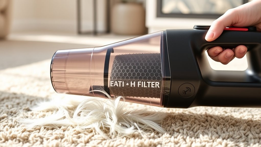 Choosing a pet hair vacuum with a HEPA filter means paying close attention to its filtration effectiveness. HEPA filters can trap at least 99.97% of airborne particles as small as 0.3 microns, including pet dander, dust mites, and allergens. A sealed filtration system is vital because it prevents unfiltered air from bypassing the filter, guaranteeing allergens stay trapped inside. This directly improves indoor air quality and helps relieve allergy symptoms. Keep in mind, regular maintenance and timely filter replacements are necessary to maintain peak performance over time. Also, look for filters tested according to standards like ASTM F1977, which verify their ability to effectively trap microscopic particles. Prioritizing filtration effectiveness ensures you get cleaner air and a healthier home environment.