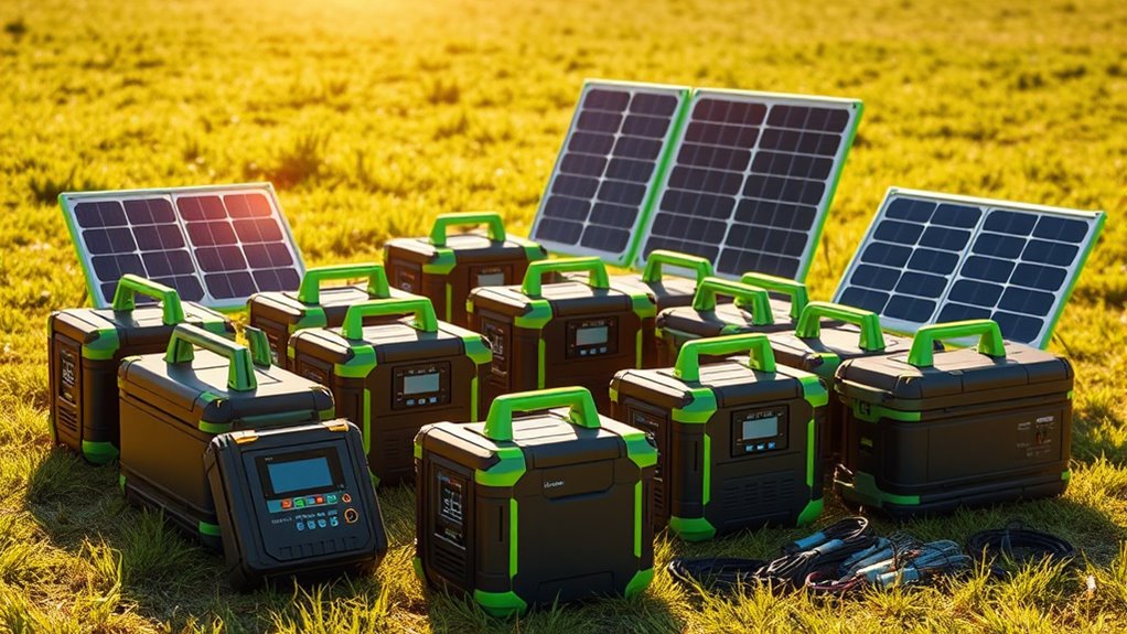 Evaluating the price and warranty options helps guarantee you get the best value and reliable support for your portable solar generator kit. I recommend comparing the initial cost against the generator’s capacity, features, and included accessories to confirm you’re getting good value. Don’t forget to review the warranty period and coverage—most range from 1 to 5 years—and consider longer warranties or extensive plans, which often include battery replacement and repairs. Higher-priced models tend to offer these extended warranties or premium support, offsetting future costs. Be sure to check the specifics of what damages or issues are covered and the claim process. This way, you avoid surprises later and ensure your investment remains protected over time.