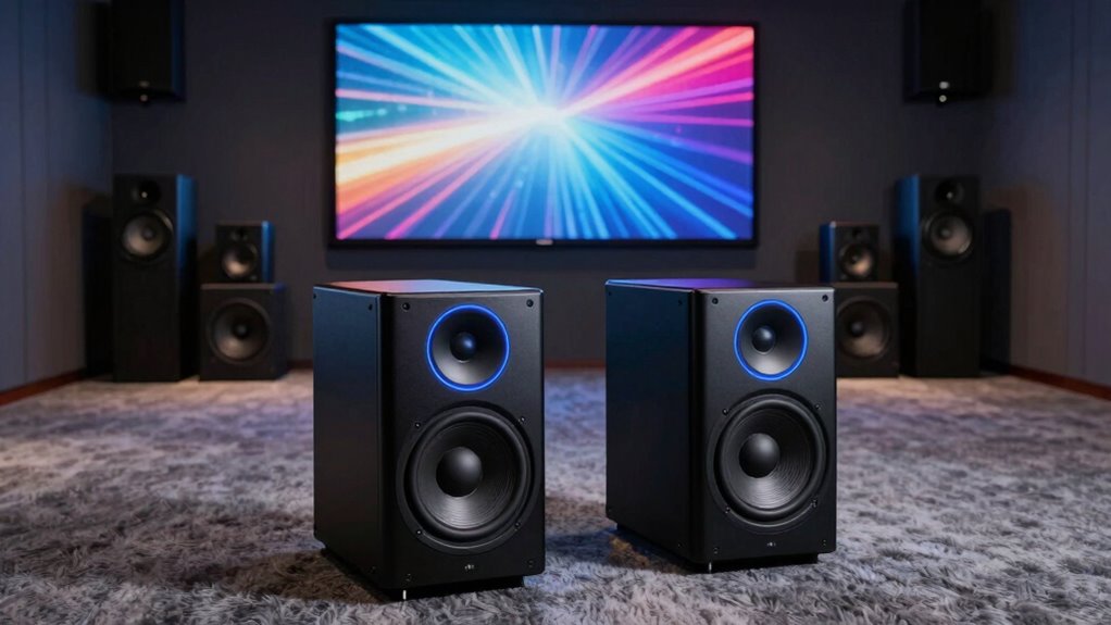 When selecting a powered subwoofer, I consider factors like power output, room size, and connectivity options to guarantee it meets my home theater needs. The bass response range and the subwoofer’s design also play vital roles in achieving deep, immersive sound. By focusing on these points, I can find a sub that complements my space and enhances my listening experience.
