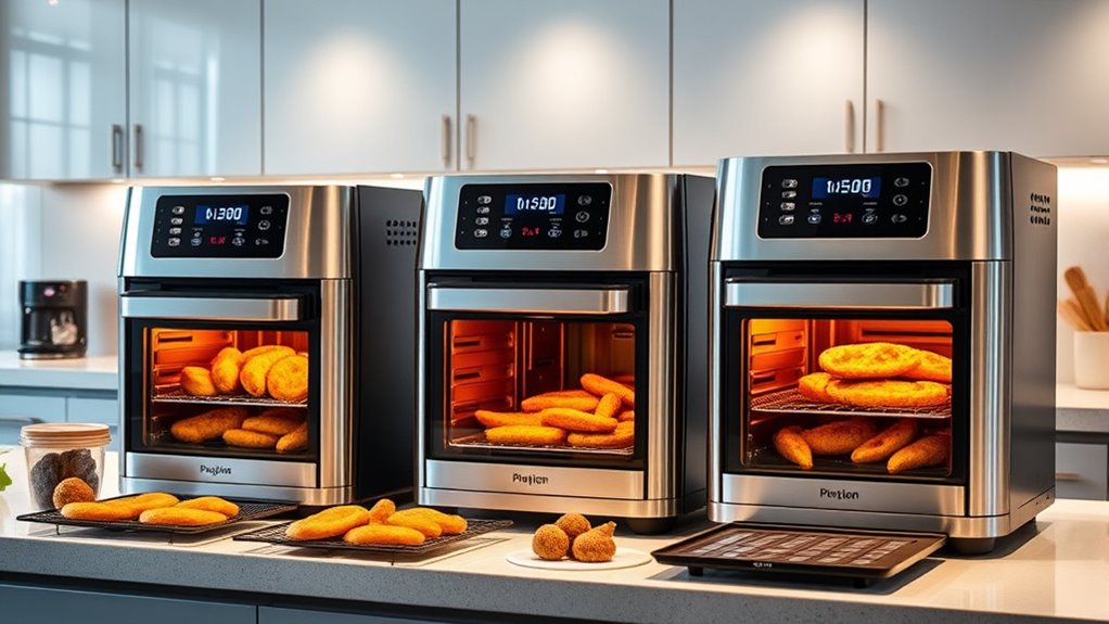 Ever wondered how much capacity you really need in an air fryer oven combo? It’s important because it determines what you can cook comfortably. Consider the oven’s capacity in quarts or liters; for example, a 12-inch pizza or a whole chicken needs ample space. Check the physical size of the appliance to guarantee it fits on your countertop without crowding your kitchen. Larger models, often 26 quarts or more, are great for family-sized meals, while smaller units suit singles or small households. Keep in mind, bigger capacity usually means a larger footprint, which could limit storage in compact kitchens. Finding a balance between size and capacity ensures your new appliance meets your cooking needs without overwhelming your space.