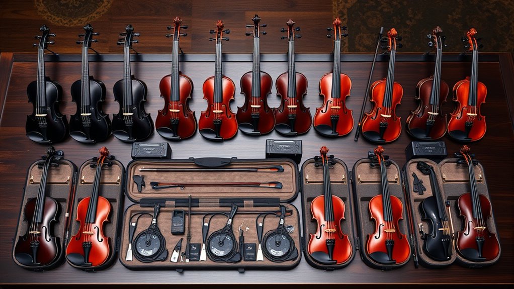 I’ve rounded up the 15 best premium electric violin starter kits for beginners in 2025, featuring top brands like Pyle, Vangoa, and Cecilio. These kits offer high-quality craftsmanship, stunning finishes, and all-inclusive accessories, making them perfect for learners of all levels. They combine great sound, stylish design, and portability. If you want to discover what makes these kits stand out and find the perfect one for you, keep exploring further.