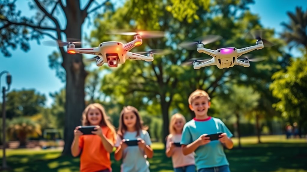 Selecting the right control options and range is essential for guaranteeing a smooth flying experience with kids’ drones. Different control methods, like remote controls, smartphone apps, gesture controls, or voice commands, offer varying levels of ease and interaction. Most beginner models have a range of 30 to 100 meters, while advanced drones can reach over 400 meters, perfect for outdoor adventures. Longer ranges mean more freedom but also require strong signals to prevent disconnection. Wireless systems at 2.4GHz or 5.8GHz typically provide more stable, longer-range connections with less lag. Features like auto-return, GPS, and obstacle avoidance further enhance control reliability, especially at extended distances or in complex environments. Choosing the right options ensures safer, more enjoyable flights for kids.