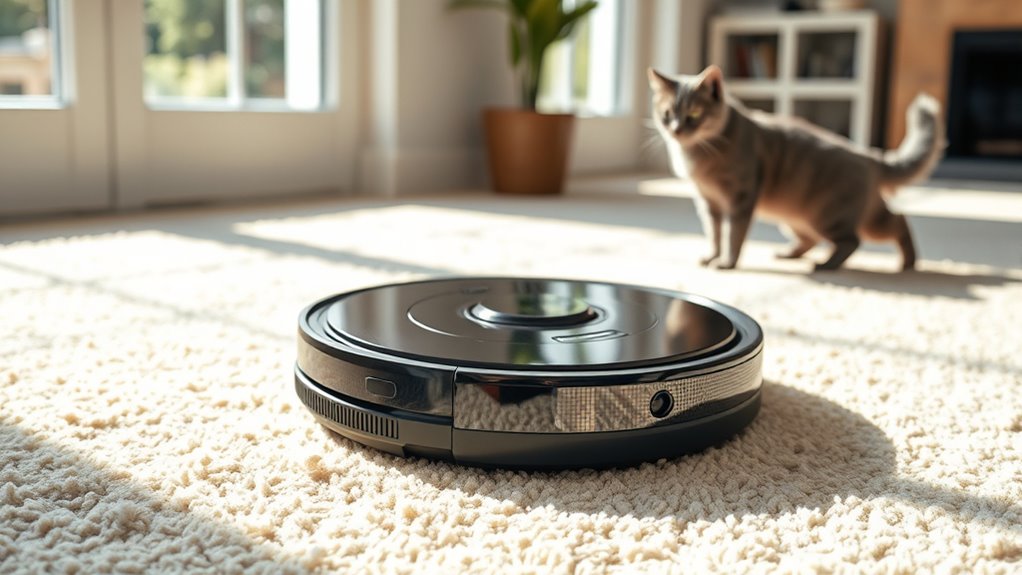 Yes, robot vacuums often need special filters to effectively trap pet allergens. I recommend models with HEPA filters, as they capture tiny particles like pet dander, pollen, and dust mites. Using a vacuum with a good filter helps improve indoor air quality and reduces allergy symptoms. I always check for a true HEPA filter to guarantee it’s capable of handling pet allergens efficiently.