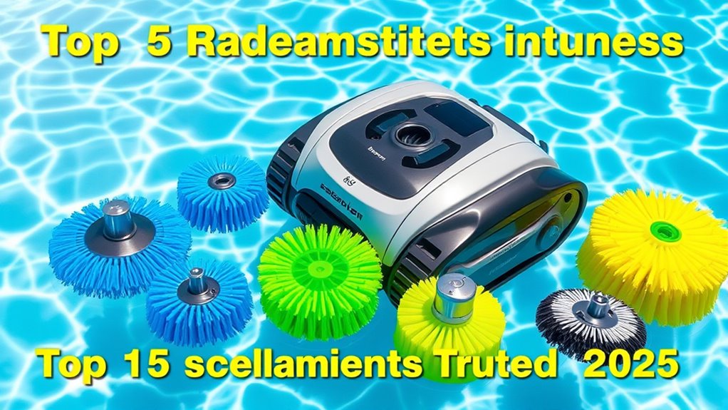 If you’re looking for the 15 best replacement brushes for robotic pool cleaners in 2025, I recommend checking options like durable PVC and silicone brushes designed for models like Dolphin, Hayward, and Polaris. Genuine parts offer longer wear and peak performance, while compatibility and easy installation matter a lot. High-quality brushes with firm bristles help keep your cleaner effective. Keep exploring, and you’ll find detailed insights to help you choose the perfect replacements.