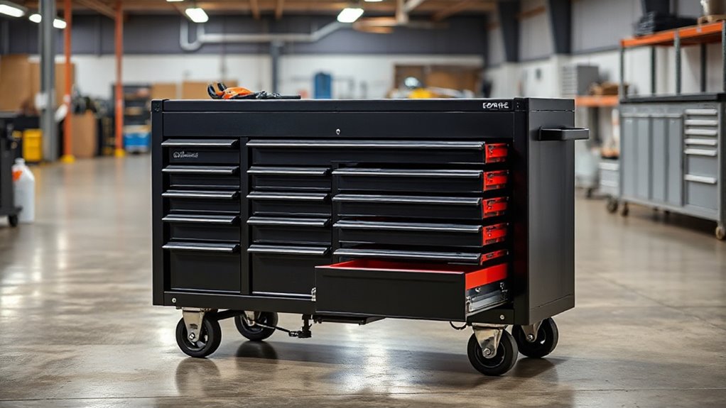 Moving a rolling tool chest with deep drawers smoothly and safely depends heavily on its casters and handles. I look for at least four swivel casters to ensure easy, multidirectional movement across various surfaces. Locking brakes are a must—they keep the chest steady during use, preventing accidental shifts. Ergonomic handles or side grips make repositioning effortless, reducing strain. I also check the weight capacity and size of the casters to support the fully loaded chest without wobbling or causing damage. Rubber or similar materials on the casters are ideal—they protect floors from scratches and dampen noise during movement. Overall, quality casters and handles are essential for maneuverability, helping me work efficiently without worry about stability or floor damage.