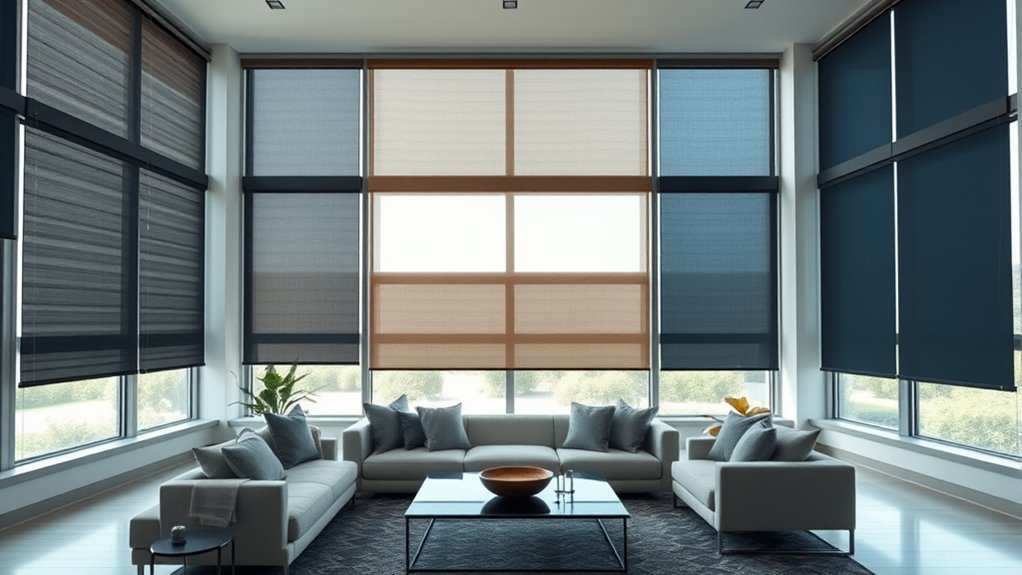 Smart blinds come with safety features like auto-reverse, which acts like a vigilant guardian, stopping the blinds if something’s in the way. They also include child-proof controls and limit stops to prevent pinching or overextension. Many models have integrated sensors that detect obstacles or sudden movements, ensuring safety for everyone. These thoughtful features make smart blinds not just smart, but safe companions for your home.