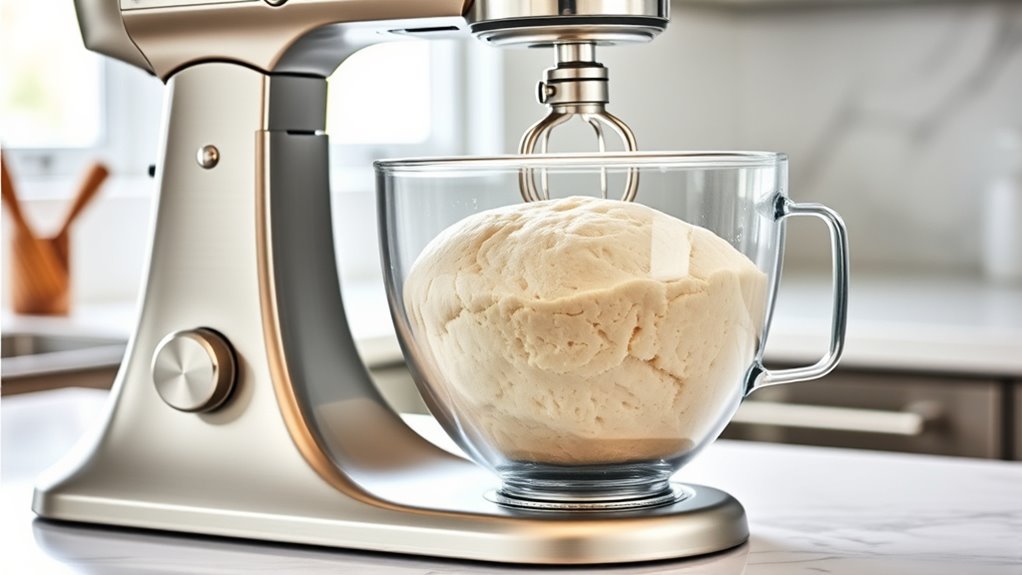 Choosing a stand mixer with at least 1,000W of power guarantees it can manage dense bread dough without straining. Higher wattage motors deliver more torque, helping the mixer maintain consistent speed during tough kneading tasks. This means you can work through large batches or stiff dough repeatedly without overheating or risking motor burnout. A powerful motor also ensures the mixer’s performance remains stable over prolonged use, preventing loss of power or uneven mixing. When combined with planetary mixing action, this strength guarantees thorough incorporation of ingredients, which is essential for high-quality bread. Overall, a robust motor provides the reliability and efficiency needed for serious bread baking, making it a key factor in selecting the best stand mixer for dense doughs.