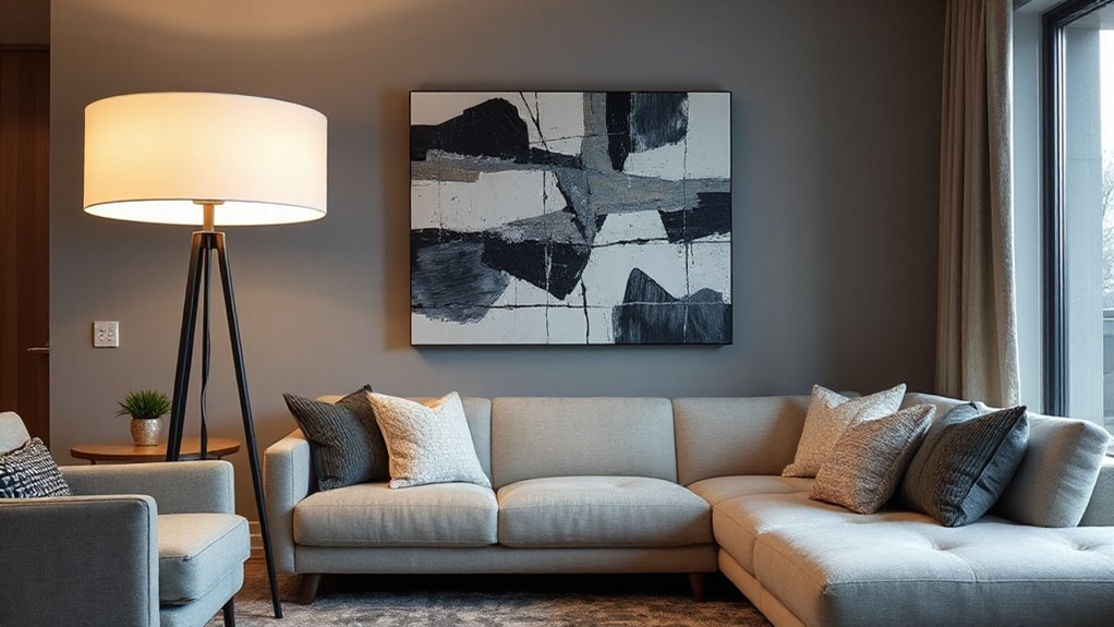 Choosing the right spot for your statement floor lamp involves evaluating the available space carefully. I look for a location where the lamp can act as a focal point without blocking walkways or furniture flow. Placing it near seating areas or artwork helps highlight those features while maintaining balanced visual weight in the room. I also consider natural light sources, positioning the lamp to complement daylight and avoid glare. Accessibility matters too—I want switches or remotes within easy reach without disrupting traffic patterns. For adjustable lamps, I pay attention to height and arm reach, ensuring ideal lighting angles and avoiding harsh shadows. Thoughtful placement enhances both the room’s aesthetic appeal and functionality, making the statement lamp a seamless part of the space.