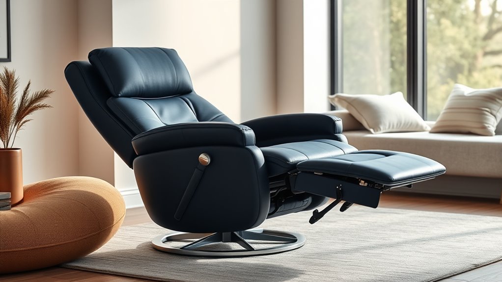 To guarantee my zero-gravity recliner offers the perfect level of comfort, I focus on its adjustability and features. I look for models with multiple adjustable positions, including infinite tilt options, so I can customize the recline for different activities. Motorized controls are a must for effortless adjustments of the backrest, leg rest, and headrest—no manual effort needed. Additional features like lumbar support, massage functions, or heat therapy can notably enhance relaxation and address specific needs. User-friendly controls, such as remote or touchpad interfaces, ensure quick, precise adjustments. I also consider convenient extras like USB ports, cup holders, or built-in lighting to boost functionality. These features make the recliner not just comfortable but also highly practical for everyday use.