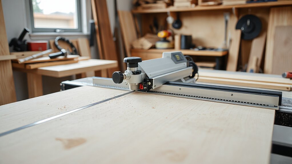 A high-quality track system is vital for achieving clean, accurate cuts in plywood. I look for tracks made from durable materials like aluminum or steel, which guarantee stability and long-term straightness. Precise manufacturing tolerances are essential because they prevent flexing or warping during cuts, maintaining accuracy even with frequent use. Anti-slip features, such as rubber strips or textured surfaces, help keep the track firmly in place, reducing any shifting that could ruin a cut. Compatibility with various saws and connectors is also important, allowing seamless extension for larger projects. Additionally, well-designed tracks include anti-chip strips and glide strips, which improve cut quality by minimizing tear-out. Overall, a reliable track system is the backbone of precise, clean plywood cuts.
