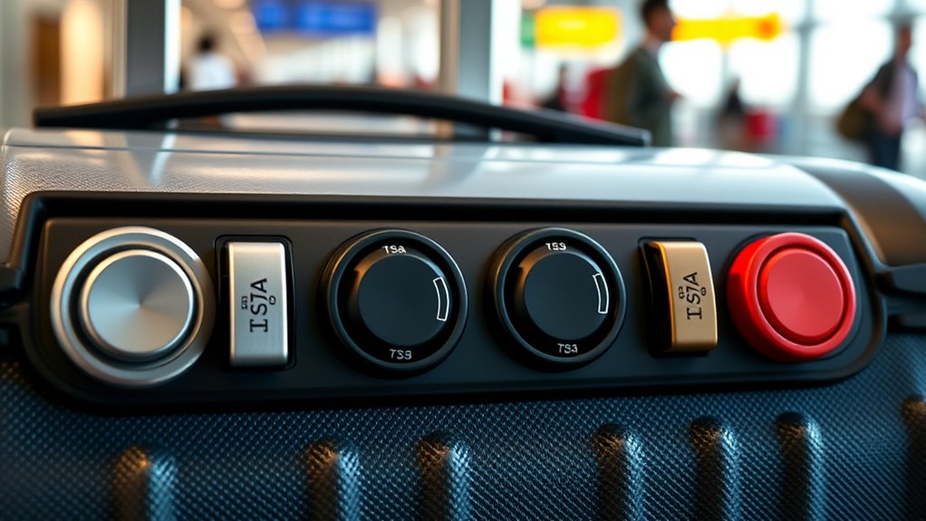Since TSA re-locking mechanisms are designed to secure luggage after inspection, it’s vital to select locks that automatically re-engage once opened by TSA agents. These locks feature internal components that lock themselves again after an agent uses the special key. This means your luggage stays securely locked during transit, reducing the risk of theft or accidental exposure. Unlike standard TSA locks, re-locking models ensure the bag isn’t left unlocked, providing added peace of mind. When choosing a TSA-approved lock, check if it has a reliable re-locking feature that activates seamlessly after inspection. This automatic re-engagement is essential for maintaining security without requiring manual locking each time, making your travel experience smoother and more secure.