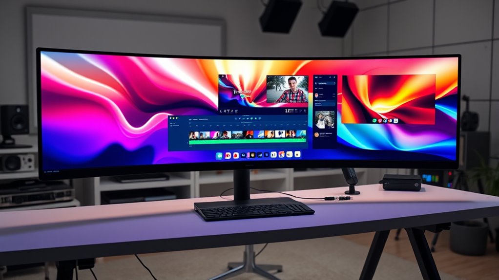 When choosing an ultrawide monitor for video editing and multitasking, I consider factors like resolution, color accuracy, and size to guarantee ideal performance. Connectivity options and ergonomic adjustments also matter to keep my setup flexible and comfortable. Understanding these points helps me pick a monitor that truly meets my workflow needs.
