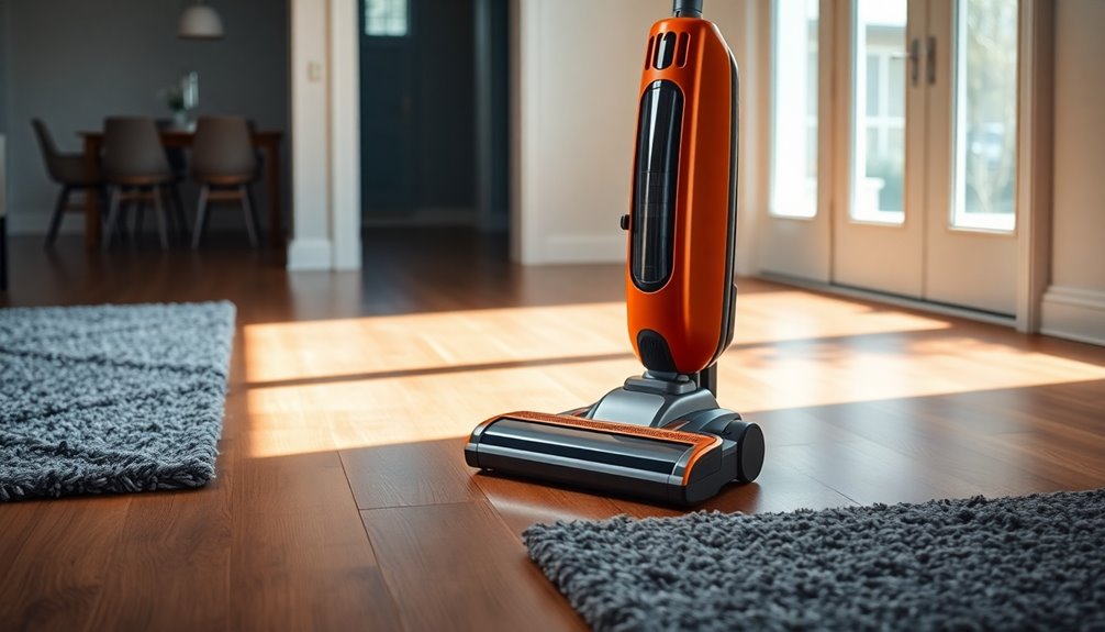 Some models even boast advanced technologies, such as self-cleaning brush rolls that prevent hair wrap. This not only keeps the vacuum running smoothly but also cuts down on maintenance time. And if you're like me and often clean hard floors, look for scatter-free technology. It helps prevent debris from scattering, guaranteeing a thorough clean every time. All these features combined truly enhance the versatility of upright vacuums, making them an invaluable tool for any home.