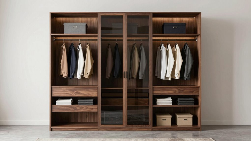 Ensuring safety features are integrated into your wardrobe armoire is essential to prevent accidents and protect everyone in your home. Anti-tip kits and wall anchoring are crucial, as they prevent the armoire from tipping over, reducing injury risks. Secure door closures, like magnetic or latch systems, help keep doors shut during use, avoiding accidental openings. Adjustable shelves with a weight capacity of up to 180 pounds guarantee stability and prevent collapse under heavy loads. Reinforced frames and sturdy materials such as thickened steel or MDF enhance both safety and durability. Additionally, clear, detailed assembly instructions and secure hardware are vital for proper installation, lowering safety hazards caused by incorrect setup. Prioritizing these features ensures your wardrobe is both safe and reliable.