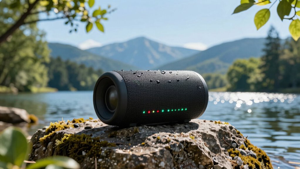 Waterproof ratings like IPX7 substantially boost a speaker’s durability by ensuring it can withstand immersion in water up to a meter deep for 30 minutes. I look for these ratings because they give me confidence that my speaker won’t get damaged during outdoor adventures or unexpected rain. It’s a practical feature that guarantees my music keeps playing, no matter the weather, and helps my device last longer in tough conditions.