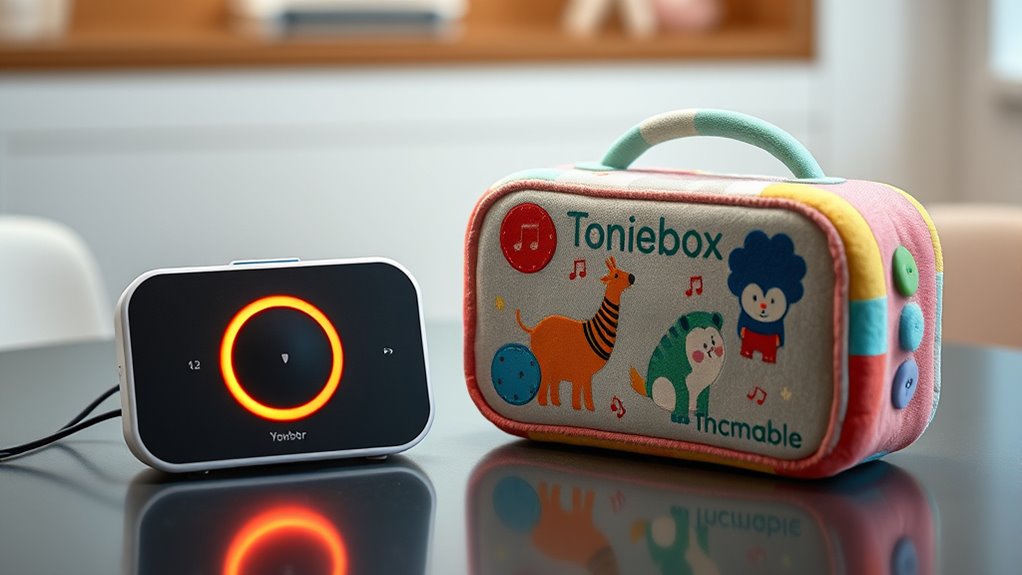 Choosing between the Yoto Player and Toniebox in 2025 depends on what you prioritize. I find that Yoto offers a broader, more customizable library with creative options, while Toniebox excels in durability and character-driven content. Both are safe, easy to use, and portable for kids. If you want to discover which one suits your child’s needs best and see detailed comparisons, keep going—there’s a lot to uncover.